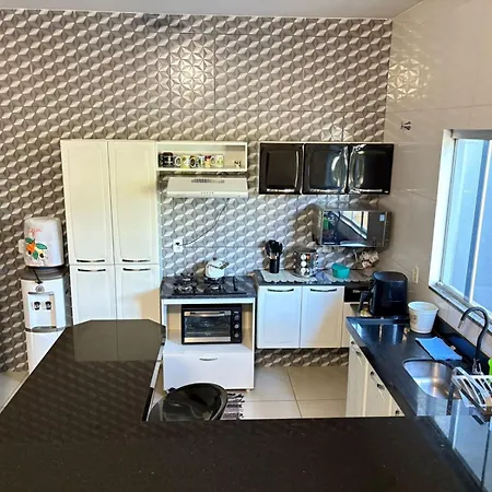 Casa Temporada Aconchego E Tranquilidade 1 Villa offers a fully-equipped kitchen featuring a fridge, an oven, and kitchenware. - ❓